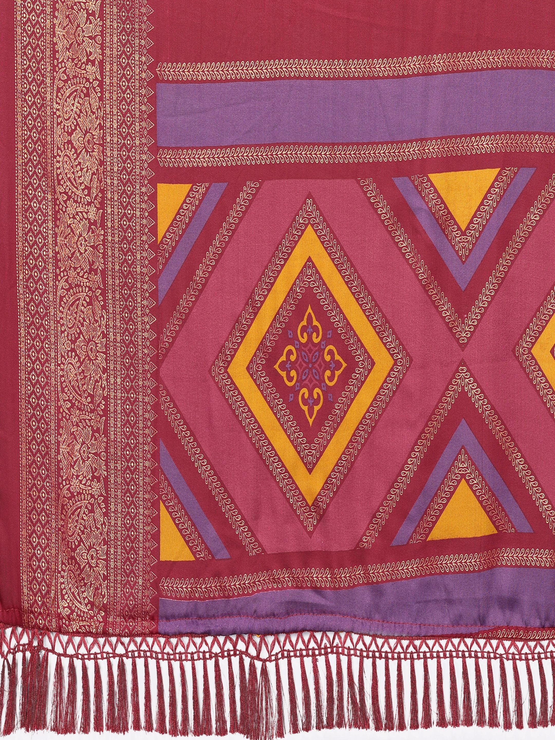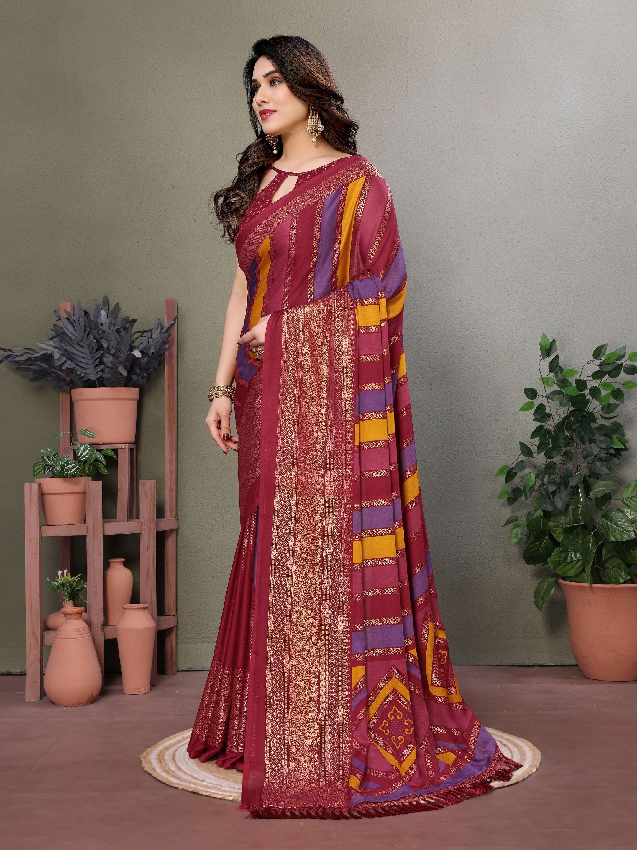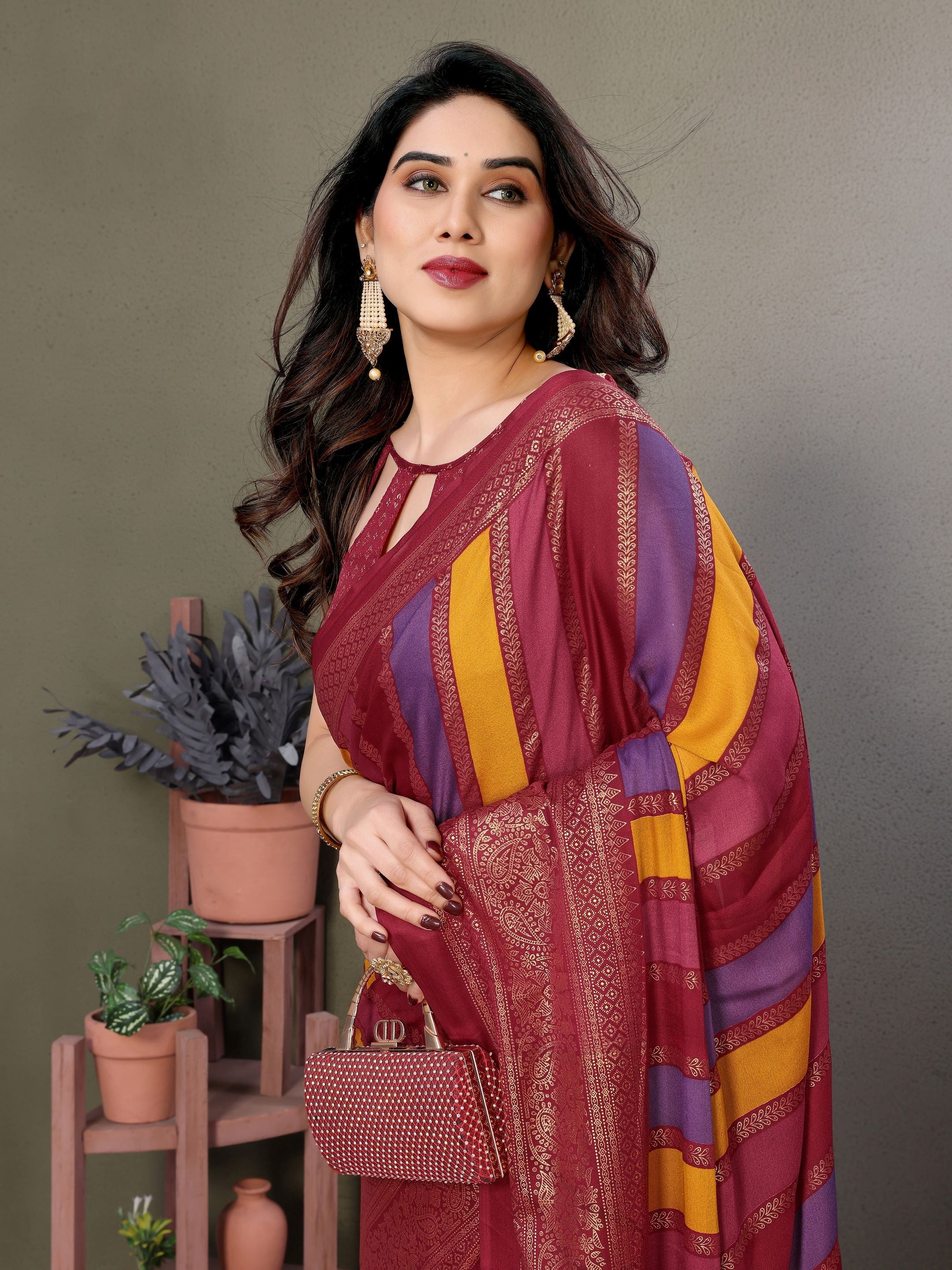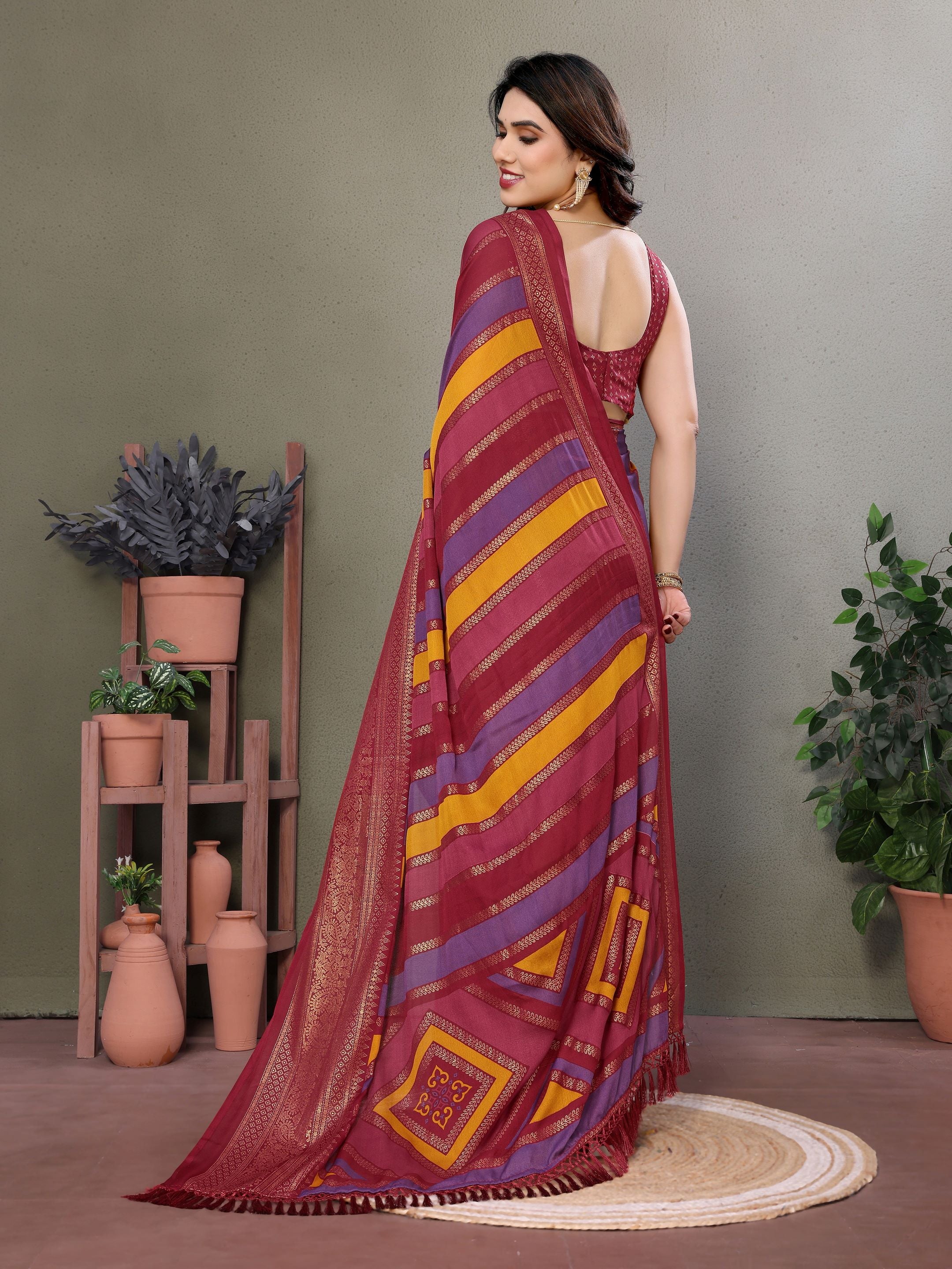 Maroon Striped Embellished Foil Printed Georgette silk saree