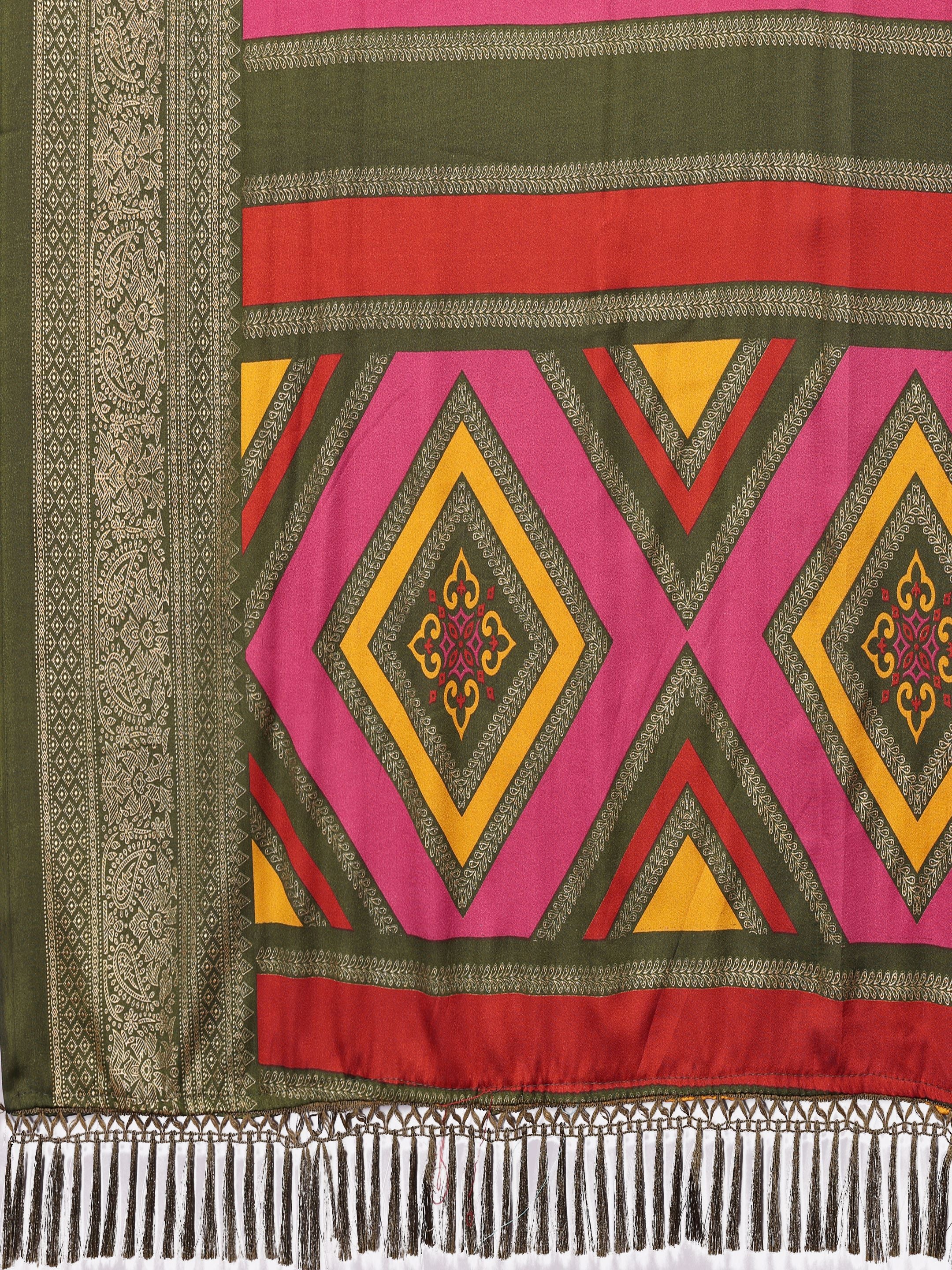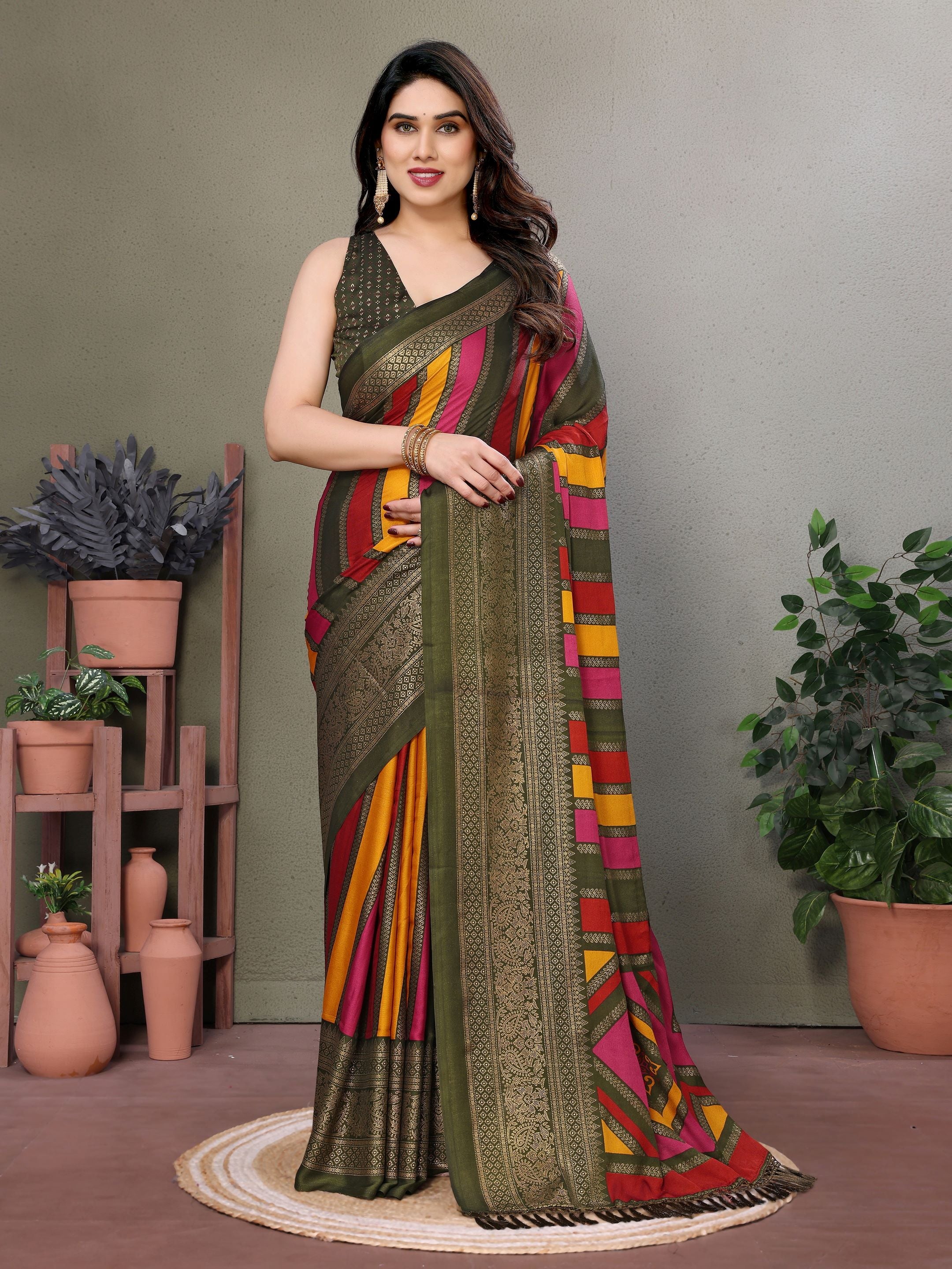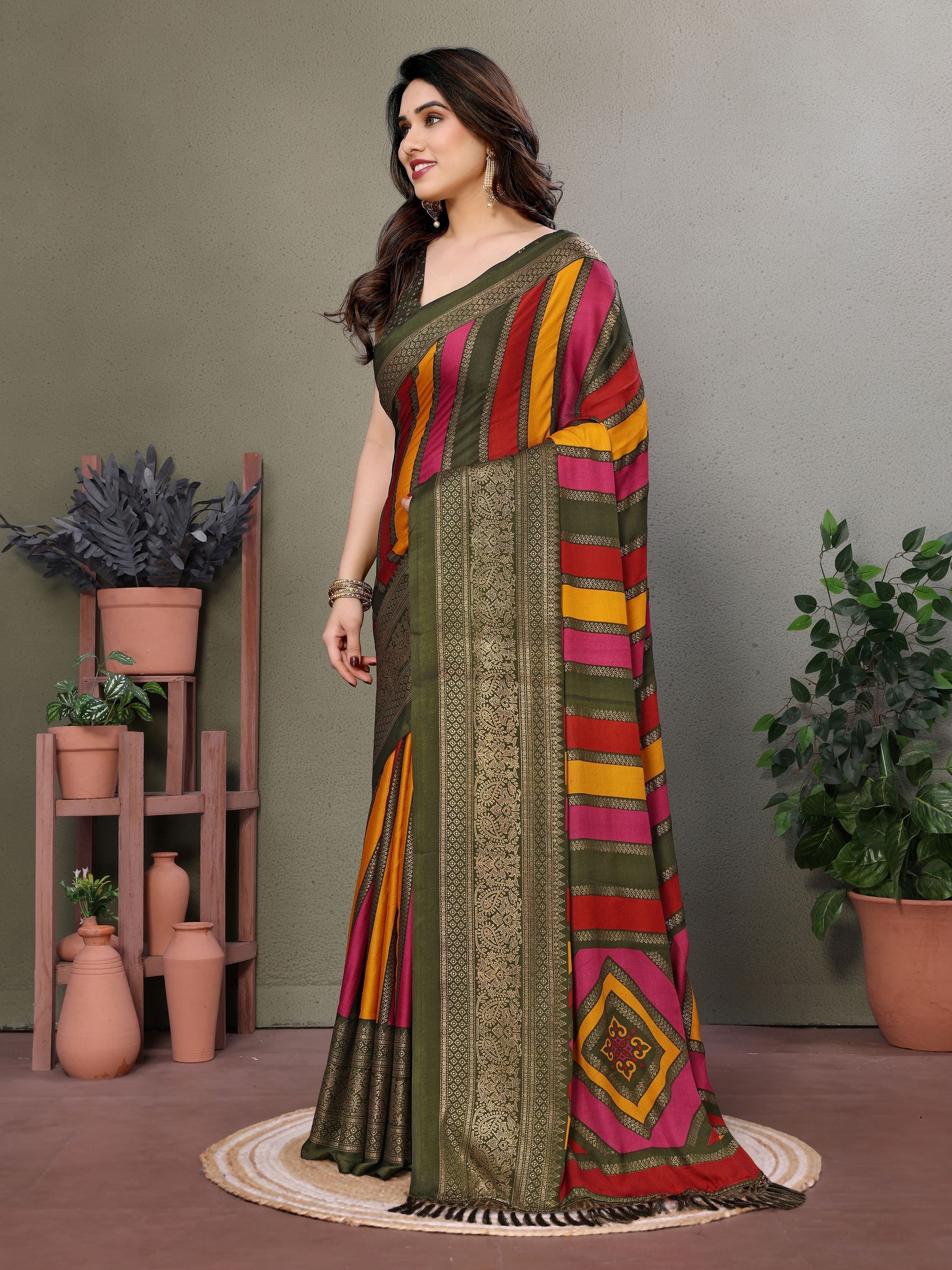 Mehendi Green Striped Embellished Foil Printed Georgette silk saree