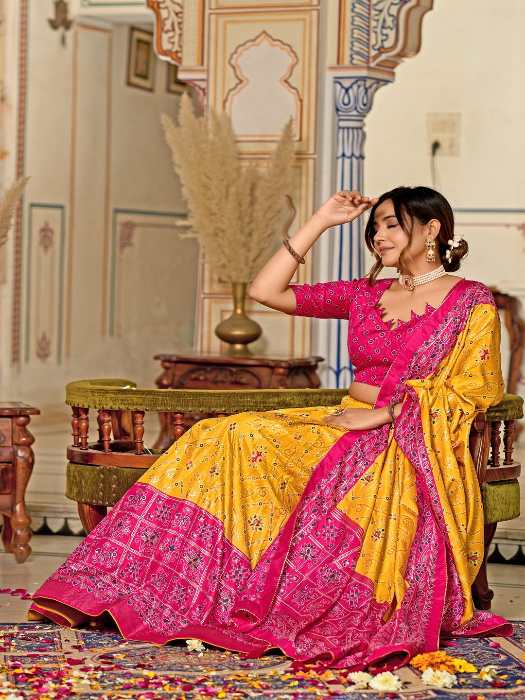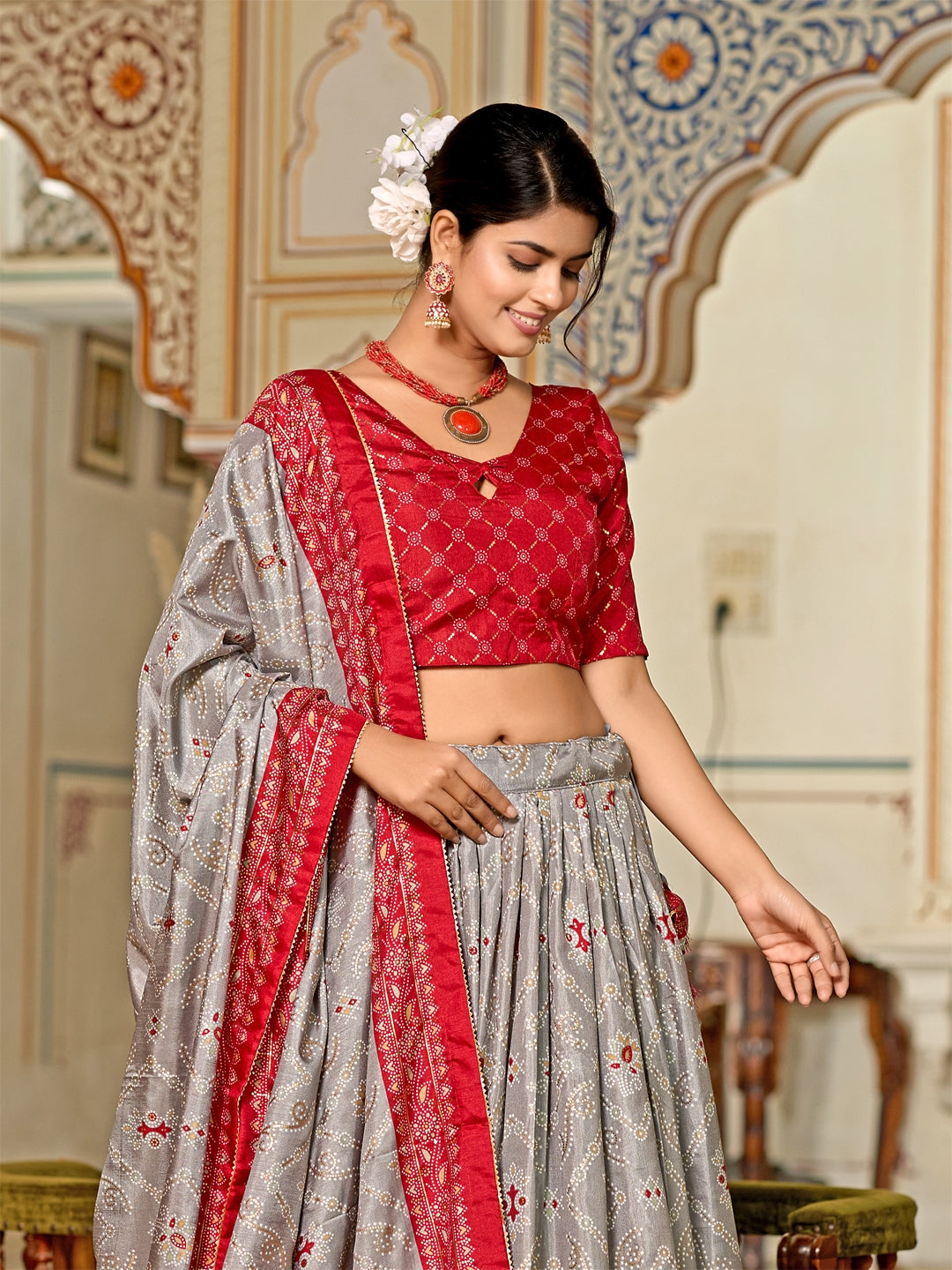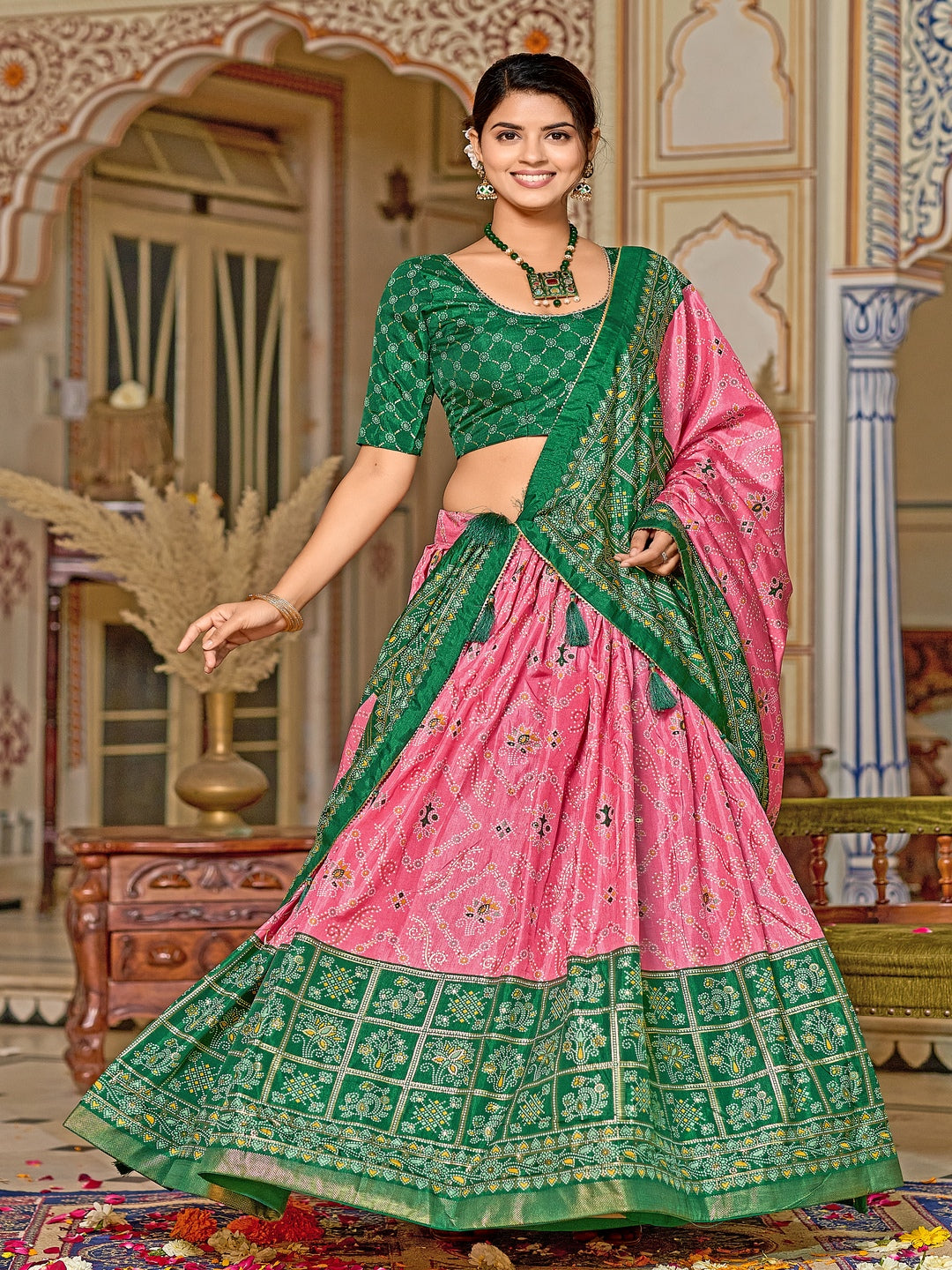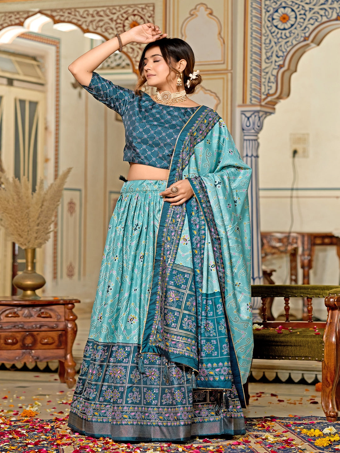 Multicolor Foil Print Minakari Work Semi-Stitched Silk Lehenga & Unstitched Blouse With Dupatta