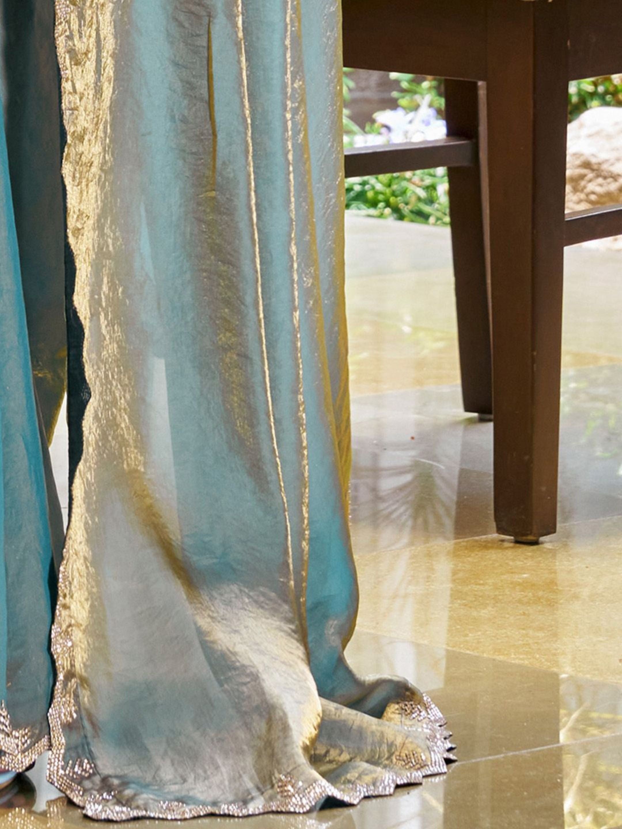 Teal Blue Embellished Swarovski Space silk Beads and Stone work saree